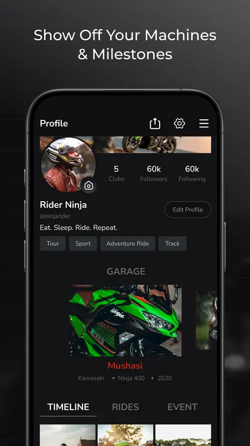 🏆 Profile & Garage – Show off your rides and Bikes.